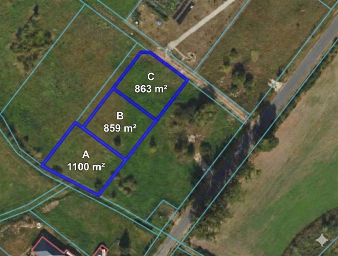 W ofercie posiadamy 3 działki (Na załączonym zdjęciu działki oznaczone są literami A, B i C)
